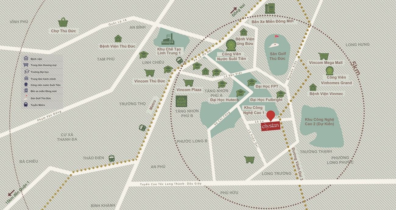 Từ Elysian dễ dàng kết nối đến các trung tâm như quận 1, quận 7, trung tâm hàng chính TP Thủ Đức.