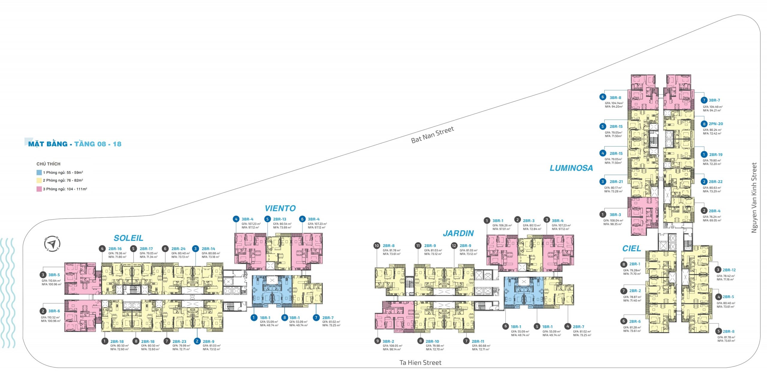 - Các loại diện tích: 55 – 108 m2 (1PN – 3PN)