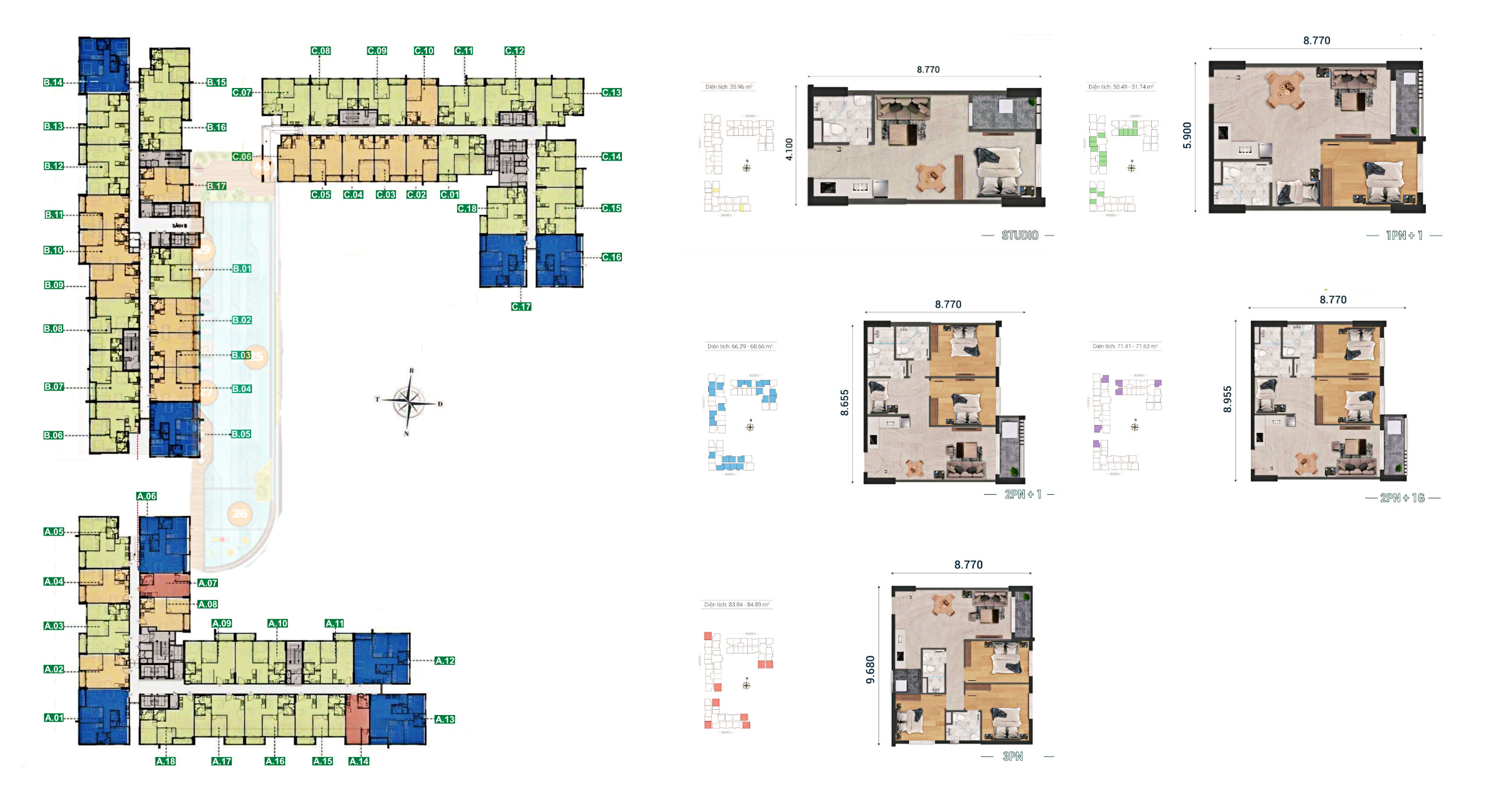 - Loại căn hộ: Studio (36m2), 1PN+1 (51m2), 2PN+1 (66-72m2), 3PN (84m2)