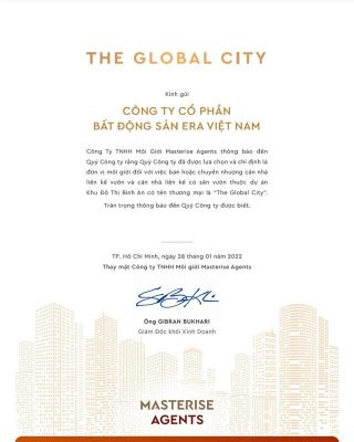 Công ty ERA Việt Nam là đơn vị phân phối F1 dự án The Global City Thủ Đức. ERA Việt Nam là thương hiệu phân phối bất động sản uy tín đến từ Mỹ, Singapore và hơn 34 quốc gia trên thế giới.
