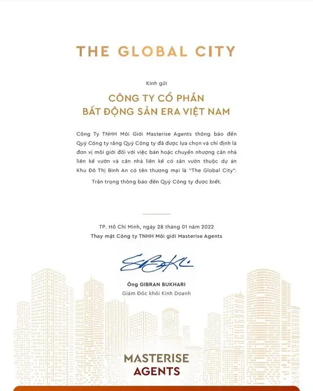 ERA Việt Nam phân phối với tư cách F1 The Global City TP Thủ Đức, TP HCM. Đây là dự án mà ERA Việt Nam tham gia với vai trò là phân phối trực tiếp, F1. Với mong muốn mang tới cho quý khách hàng có thêm cơ hội đầu tư tại một dự án có vị trí vô cùng đắc địa cũng như hiếm còn tại TP Thủ Thức, TP HCM như The Global City.