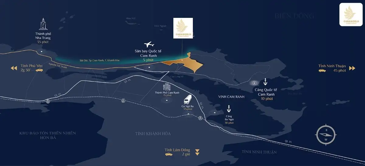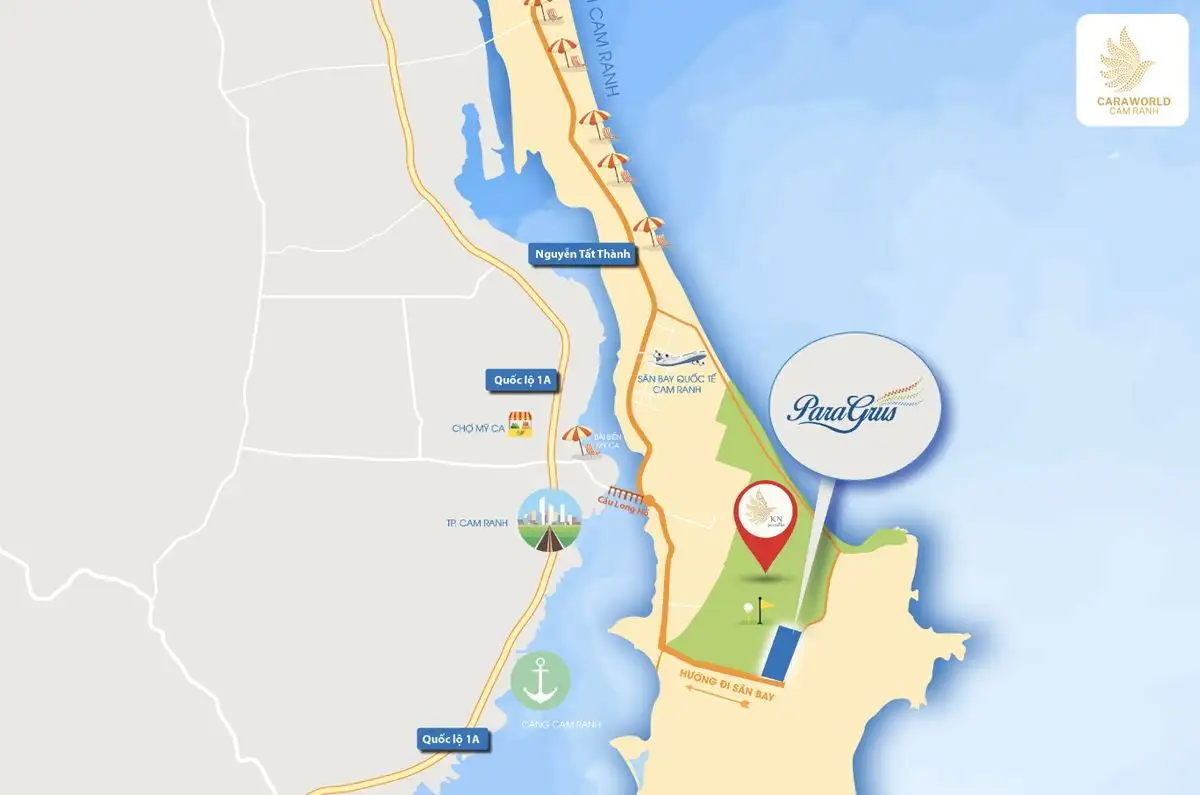 Vị trí Caraworld Cam Ranh tọa lạc tại Bãi Dài, Cam Nghĩa, Cam Ranh, Khánh Hòa. Dự án sở hữu vị trí cách sân bay quốc tế Cam Ranh, chỉ cách đó khoảng 5 phút di chuyển. Cách thành phố Nha Trang chỉ khoảng 30 phút di chuyển.